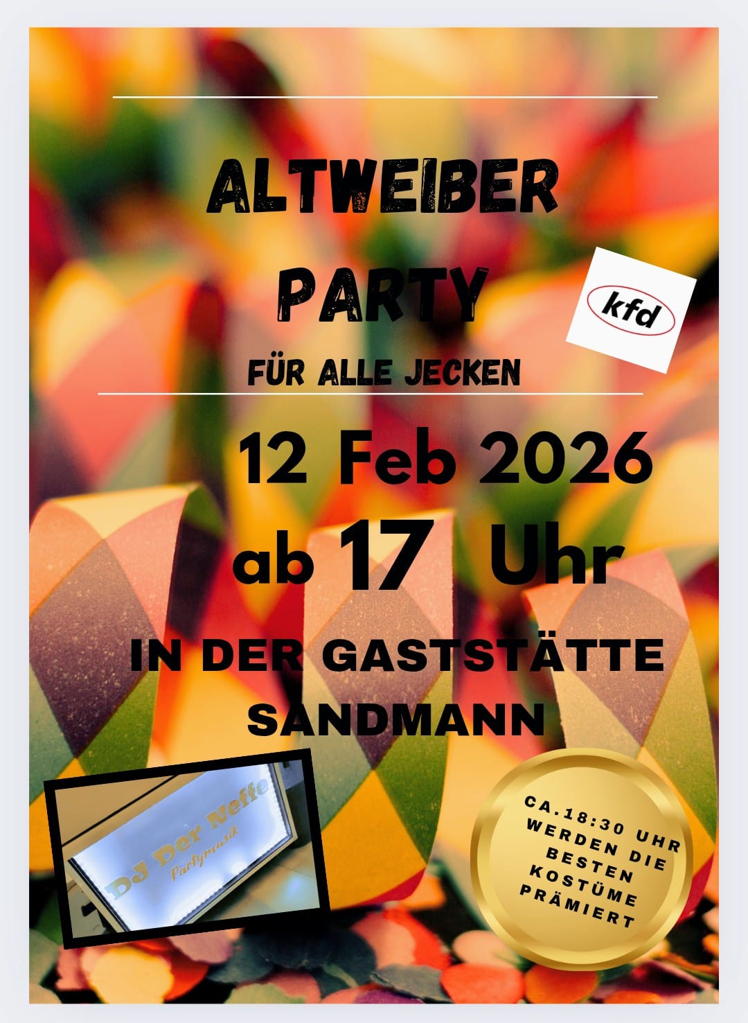 Die KFD Welbergen lädt alle interessierten LangenhorsterInnen mit Spaß am Karneval zur diesjährigen Altweiber-Party am 12. Februar (Donnerstag) ein. Gefeiert wird ab 17 Uhr in der Gaststätte Sandmann.