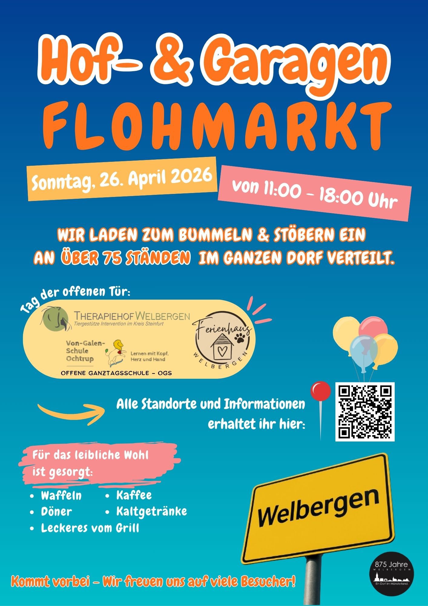 Am 26. April (Sonntag) findet in Welbergen von 11 bis 18 Uhr der Hof- und Garagenflohmarkt statt. Alle sind herzlich eingeladen, natürlich auch alle LangenhorsterInnen. An über 75 privaten Ständen vor und an Wohnhäusern kann im ganzen Dorf gestöbert und vielleicht auch der ein oder andere interessante oder praktische Artikel entdeckt und erworben werden. Ebenfalls angeboten werden einige Speisen und Getränke wie Waffeln, Döner, Gegrilltes, Kaffee und verschiedene Kaltgetränke.