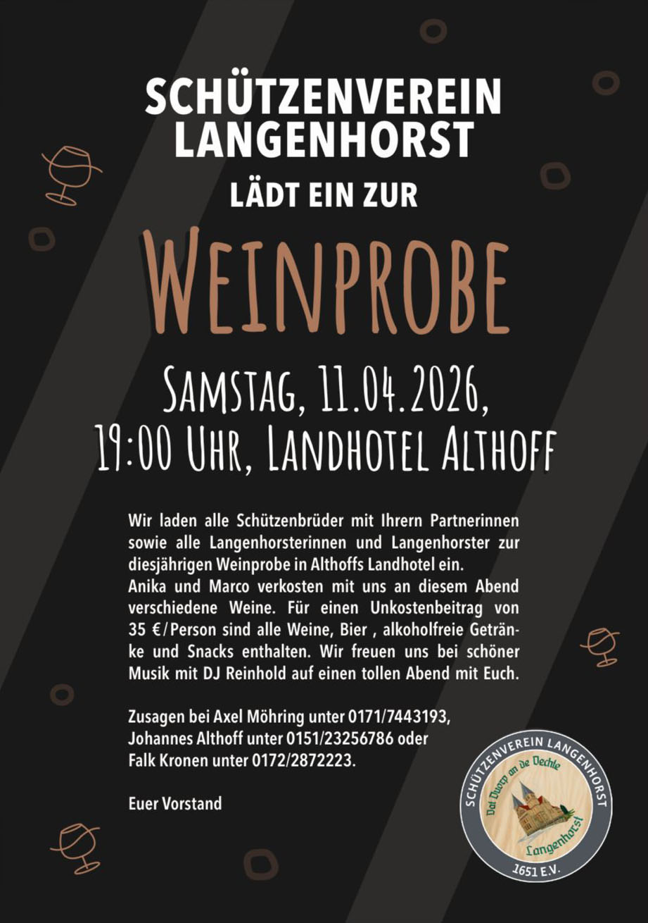Erstes Arbeitspaket wird das Schützenfest 2026, das wie gewohnt an Pfingsten in Langenhorst für das ganze Dorf gefeiert wird. Hier gilt es nun, zügig zu organisieren und alles für ein schönes Fest in die Wege zu leiten. Informationen zum Ablauf erhalten alle Schützenbrüder rechtzeitig.